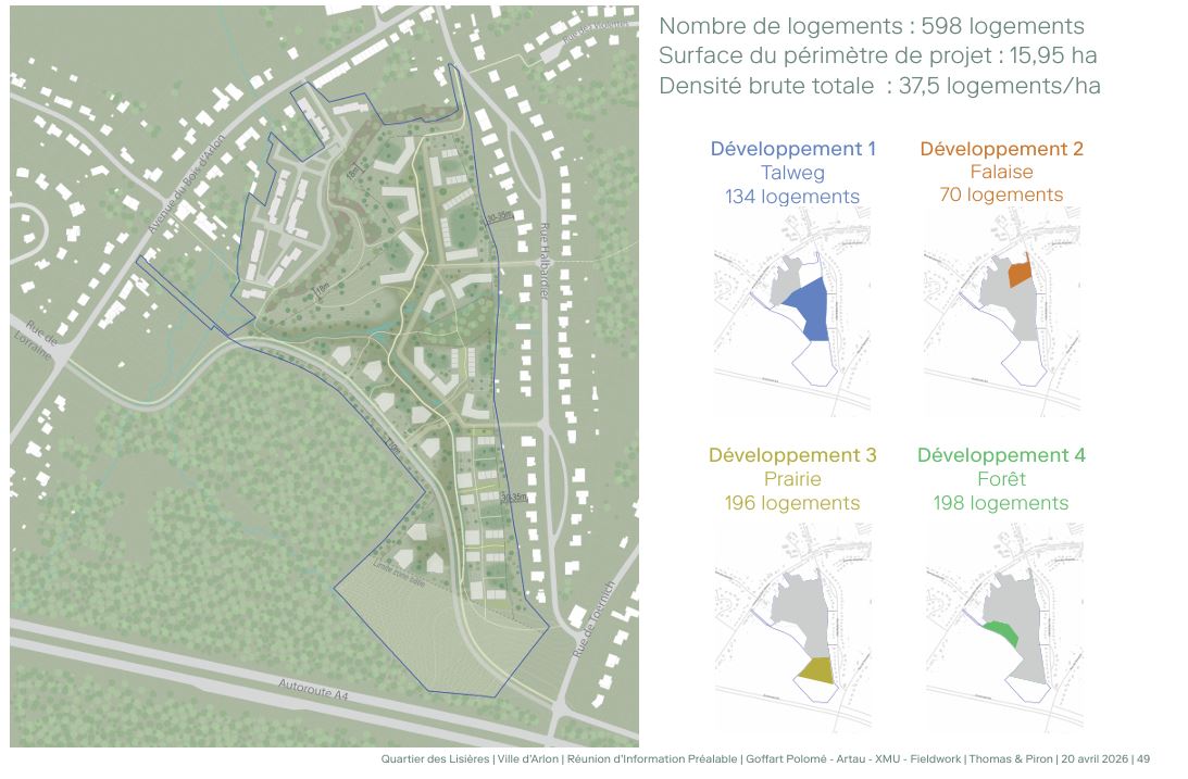 Débutée en 2017, la première phase n'a pas laissé de bons souvenirs chez ces riverains qui avaient crié leur désarroi face à une commune peu attentive à leurs revendications. Aujourd'hui, les premiers blocs d'immeubles sont installés dans cette ancienne carrière de sable, le long de l'avenue du bois d'Arlon, mais le projet est loin d'être clôturé. Prié de revoir sa copie après un recours de la Ville d'Arlon devant le Conseil d’État , Thomas et Piron présente aujourd'hui un plan global sur un périmètre de 15,95 ha compris entre la rue Halbardier et un bois situé le long de l'autoroute.