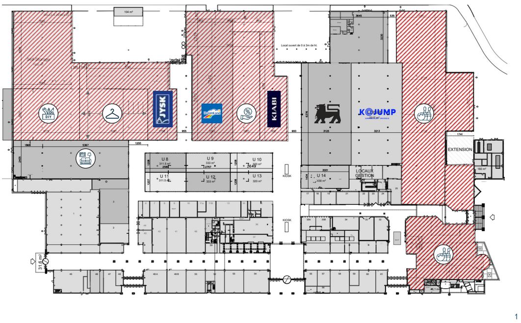 Si le logo sur le plan reprend un jeu de bowling (à droite), l'occupation exacte de ces espaces n'a pas encore été précisée. Par contre, on connaît depuis plusieurs semaines le noms des enseignes qui s'installeront au milieu de l'espace laissé libre par l'hypermarché : Dreamland, Kiabi et Jysk seront au coeur d'une nouvelle galerie.