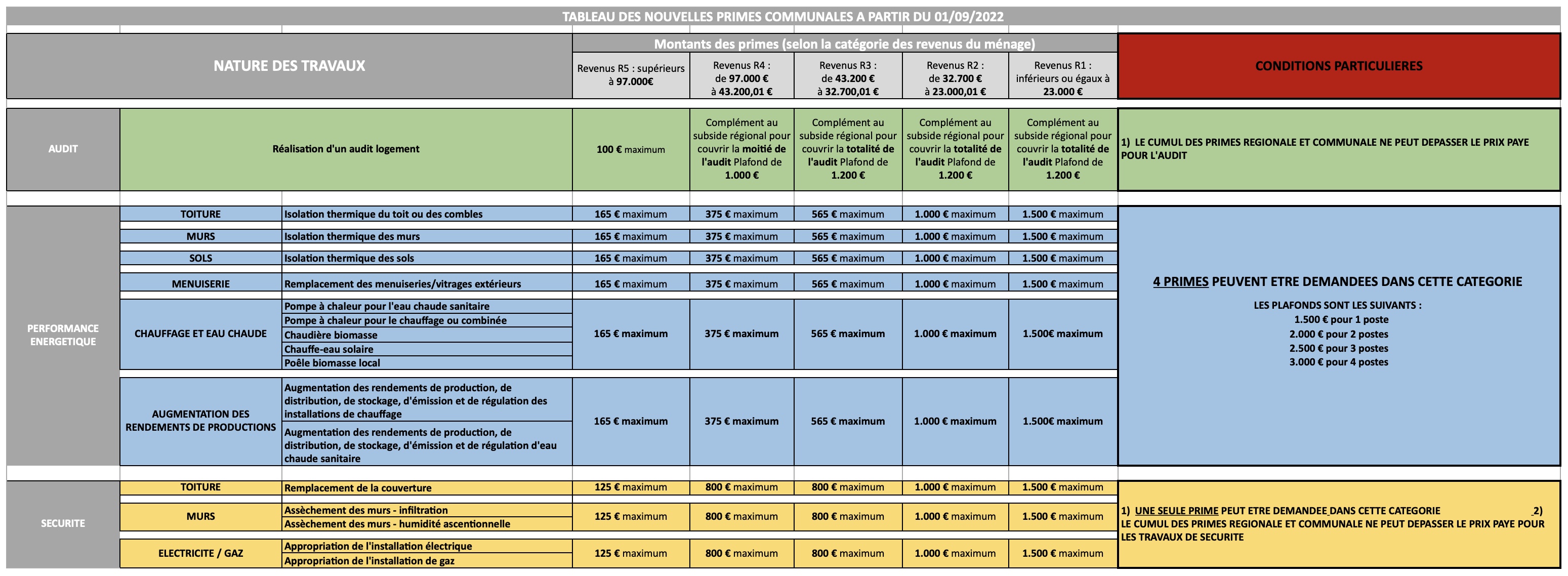 Pour facilité la compréhension des demandeurs, la commune a calqué les conditions d'octroi de ses primes sur celles de la région wallonne. En cumulant les deux par exemple, les foyers dont les revenus cumulés sont inférieurs à 43.200€ ne paieront pas le moindre euros pour la réalisation d'un audit énergétique, obligatoire avant tous autres travaux, pour autant que la facture n’excède pas 1200 euros. Pour les revenus entre 43.200€ et 97.000€, celle-ci sera prise en charge pour moitié.