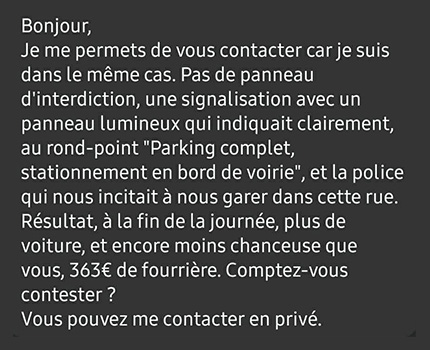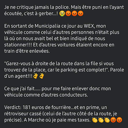 Protestant de sa bonne foi auprès de deux agents qui surveillaient les opérations, ceux-ci lui ont répondu qu’ils exécutaient les injonctions de leurs collègues. Manifestement, même si des panneaux d’interdiction de stationner bordent cette voirie secondaire, tous les agents n’avaient pas la même information.