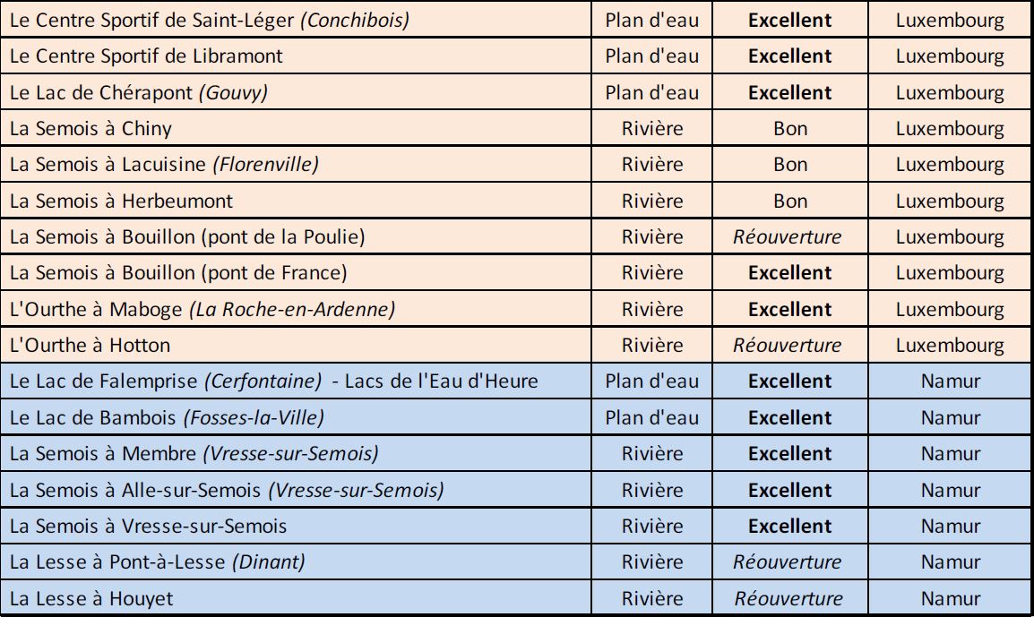 La Ministre wallonne de l’Environnement, Céline TELLIER, a dévoilé la liste des 24 sites officiels de baignade en plein air qui seront ouverts au public dès le 15 juin 2020. Parmi ces 24 sites, 10 se situent en province de Luxembourg. Dont deux rouvrent cette année : La Semois à Bouillon au pont de la Poulie ainsi que l’Ourthe à Hotton. Les plans d’eau de Saint-Léger, Libramont et Chérapont (Gouvy) obtiennent une mention « excellent » pour la qualité de leur eau. De même que la Semois à Bouillon et l’Ourthe à Maboge, dans la commune de La Roche. La ministre précise que les risques liés à la présence du COVID19 dans les eaux de baignade sont négligeables. Mais, par mesure de précaution, des recommandations ont été faites aux gestionnaires concernant l’hygiène et la distanciation physique sur les plages.