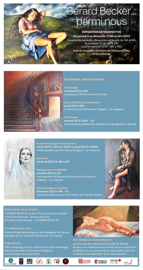 Né au Grand-Duché de Luxembourg en 1945, Gérard Becker a passé sa jeunesse à Athus. La Ville et le centre culturel d'Aubange lui consacrent une grande rétrospective avec des de très nombreuses oeuvres privées qui démontrent toute l'étendue de son talent.