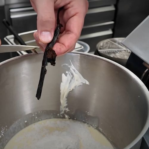 Ajoutez une demi-gousse de vanille. Écrasez-la, fendez-la en deux et grattez les graines pour en extraire tout l’arôme, sans gaspillage. Ce détail fait toute la différence.