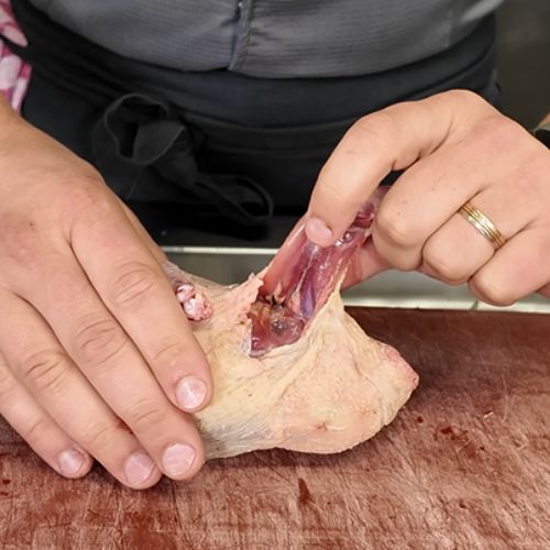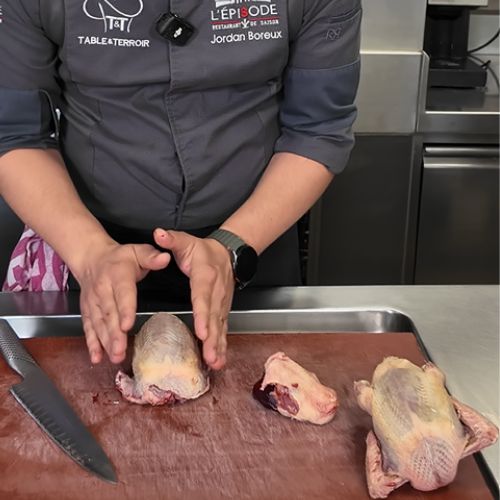 La technique de l'index : C'est l'astuce de pro de Jordan. En poussant la peau avec l'index, on déboîte la cuisse proprement. Cela permet de dégager le filet sans l'entailler, garantissant un visuel impeccable.