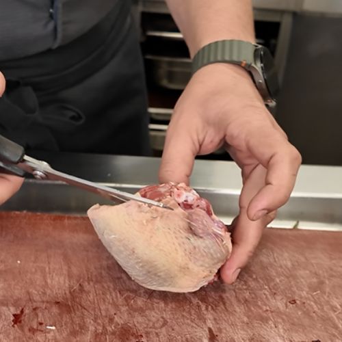 Pour faciliter le service final (l'envoi), Jordan utilise une petite astuce personnelle : il découpe l'excédent de carcasse à l'aide de ciseaux de cuisine. Cela permet d'obtenir un coffre net, prêt à être saisi, tout en éliminant les parties inutiles qui pourraient encombrer la poêle.