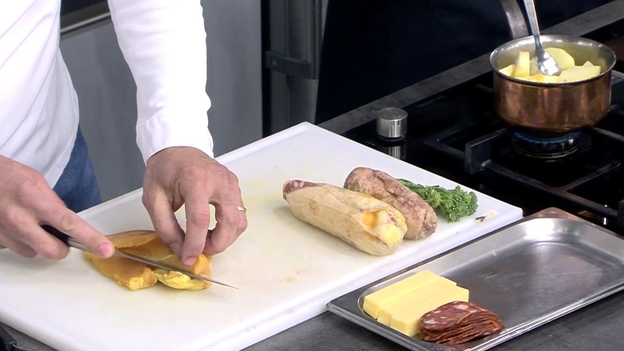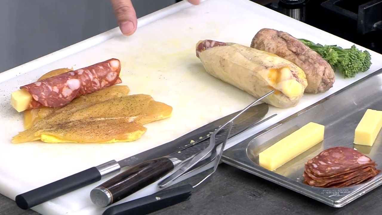 Réaliser une ballotine avec le filet de volaille, le Comté et le chorizo. Mettre sous vide et cuire à basse température afin d’obtenir une chair moelleuse et une farce parfaitement fondante.